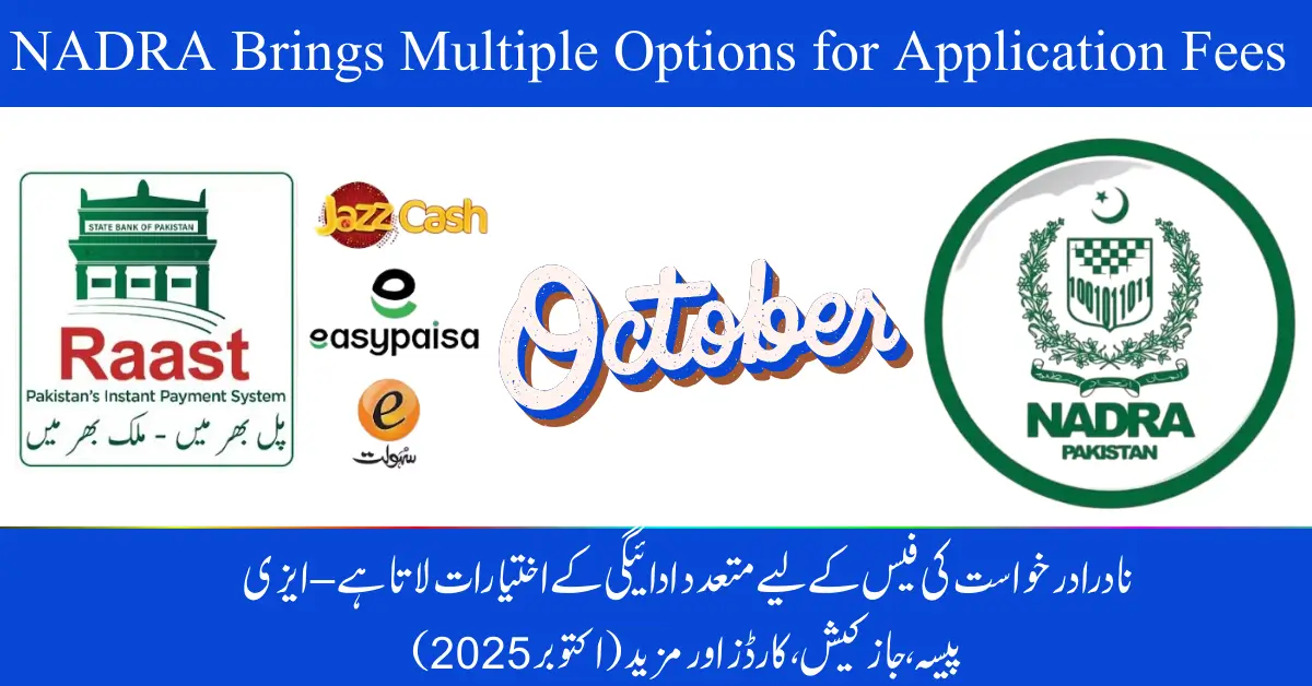 The National Database and Registration Authority (NADRA) has rolled out multiple payment options for application fees in October 2025. This new step aims to provide citizens with more flexibility, convenience, and ease in paying for their CNIC, B-Form, and other registration services.